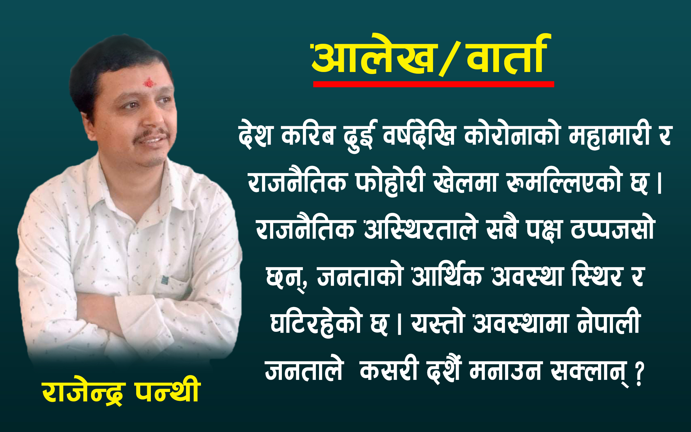 विश्वभरि फैलिएको कोरोना जस्तो डरलाग्दो महामारीले नेपाल पनि अछुतो रहन सकेन । यद्यपि अझै पनि अवस्था सामान्य छैन । यसले गर्दा नेपाली जनताको आर्थिक अवस्था जटिल बनेको छ।रोजगार, व्यापार, व्यवसाय,उत्पादन आदि स्थिर छन् । यस्तै परिस्थितिमा राज्य कोरोनासंग लड्ला भन्दा एकापसमा सत्ता र कुर्सीको लडाइँमा व्यस्त देखिन्छ । सरकारलाई करिब दुईवर्ष देखि जनताको बारेमा सोच्नेसम्म समय छैन । केन्द्रदेखि प्रदेशसम्म राज्य फोहोरी खेलमा चुर्लुम्म डुबेको छ।कहिले आँखा खोल्ने हो थाहा छैन ।