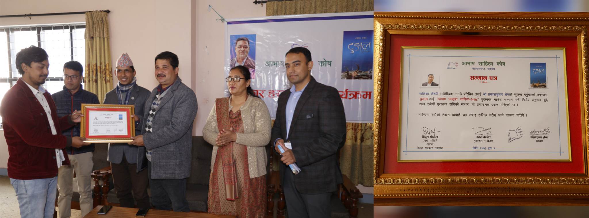 काठमाडौं । आभाष उत्कृष्ट साहित्य पुरस्कार, २०७८ साहित्यकार मालिका केशरी उपनामले परिचित प्रकाश कुमार श्रेष्ठलाई प्रदान गरिएको छ । पुरस्कार कोषले आज यहाँ आयोजना गरेको कार्यक्रममा केशरीको तिब्बती शरणार्थीको दर्दनाक अवस्थालाई चित्रण गरेर लेखिएको उपन्यास ‘दुङाल’का लागि यो पुरस्कार दिइएको हो । दुई लाख रुपैयाँ नगद र सम्मानपत्रसहितको यो पुरस्कार आज राजधानीमा आयोजित कार्यक्रममा नेपाल पत्रकार महासङ्घका अध्यक्ष विपुल पोखेरलले केशरीका भाइ प्रवीणचन्द्र श्रेष्ठलाई दिएका हुन् ।
