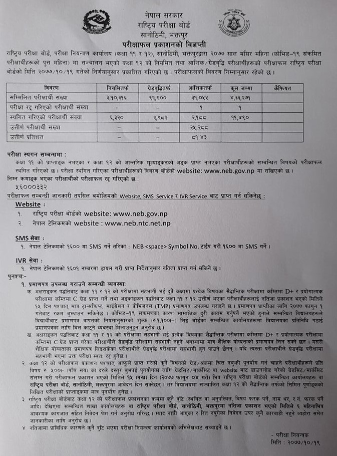 गत बैशाख ८ गते देखि सञ्चालन हुनु पर्ने कक्षा १२ को परीक्षा कोरोना भाईरस कोभिड १९ का कारण पूर्णांक घटाएर गत मंसिर ९ गते देखि सञ्चालन गरिएको थियो । कक्षा १२ लाई को परीक्षा ४० प्रतिशत पूर्णांकको मात्र थियो । बाँकी ६० प्रतिशत मध्ये ४० प्रतिशत मूल्यांकन कक्षा ११ को नतिजाको आधारमा र २० प्रतिशत आन्तरिक मूल्यांकनका आधारमा गरिएको थियो ।