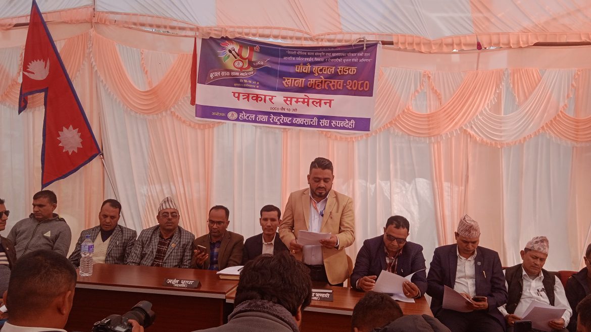 बुटवल । ‘सडकमै खाऔं, सडकमै नाचौं, सडकमै रमाऔं’ भन्ने नारा सहित शनिबारदेखि बुटवलमा सडक खाना महोत्सव हुने भएको छ । बुटवल उपमहानगरपालिकाको संरक्षकत्व, पर्यटन विकास परिषद बुटवलको प्रवद्र्धन तथा होटल तथा रेष्टुरेन्ट ब्यवसायी रुपन्देहीको आयोजनामा बुटवल उपमहानगरपालिका ९ कालिकापथ स्थित तीनकुनेदेखि उत्तरतर्फ नयाँ बस पार्कसम्मको सडकमा हुने महोत्सवको तयारी पूरा भएको शुक्रबार सचिवालयमा पत्रकार सम्मेलन गरी संघका अध्यक्ष लेखनाथ भण्डारीले बताए ।