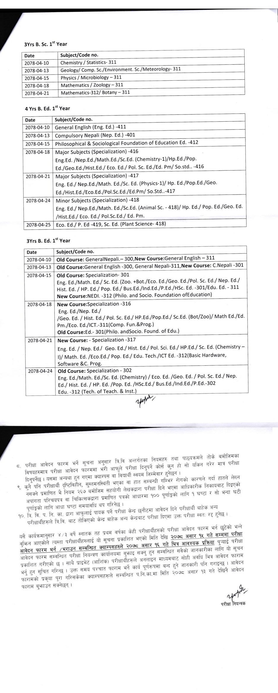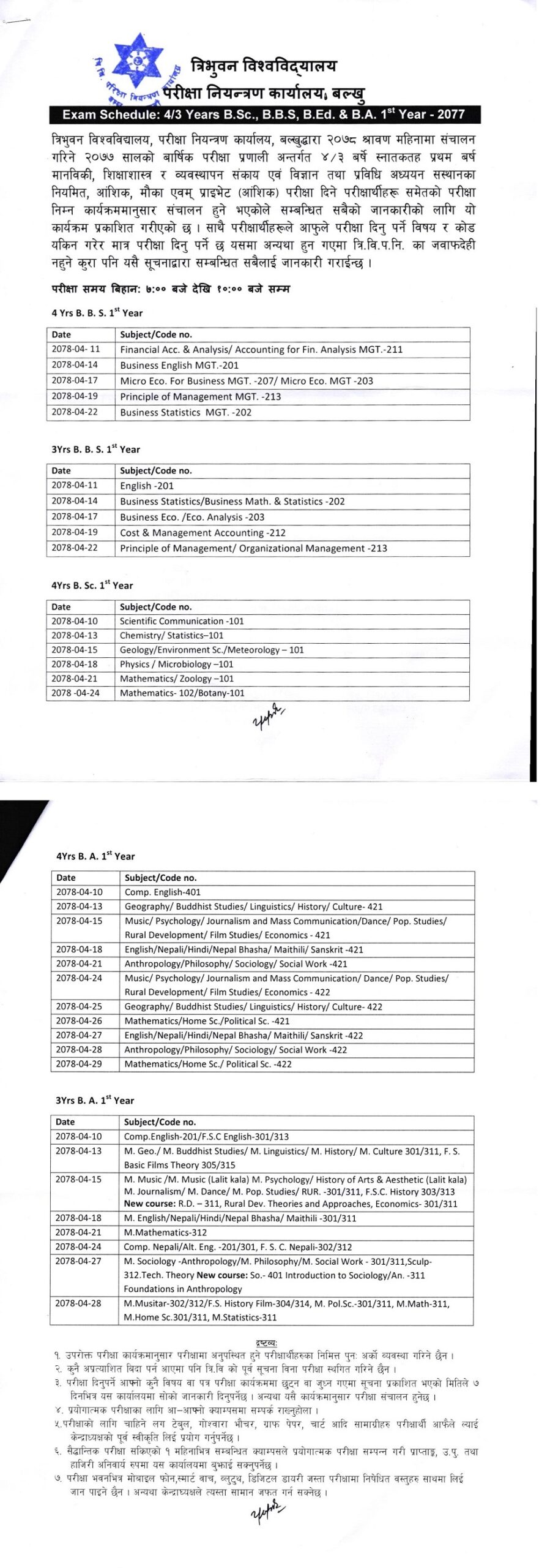 त्रिभुवन विश्वविद्यालय परीक्षा नियन्त्रण कार्यालय बल्खुले २०७८ को साउन महिनामा संचालन हुने २०७७ सालको बार्षिक परीक्षा प्रणाली अन्तर्गत ४/३ वर्षे स्नातकतह प्रथम वर्षको परीक्षा तालिका सार्वजनिक गरेको छ ।