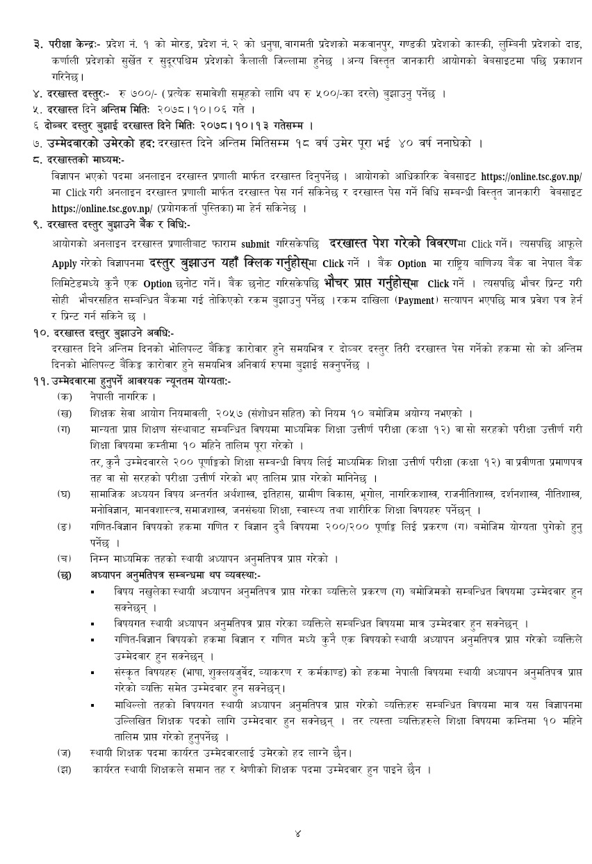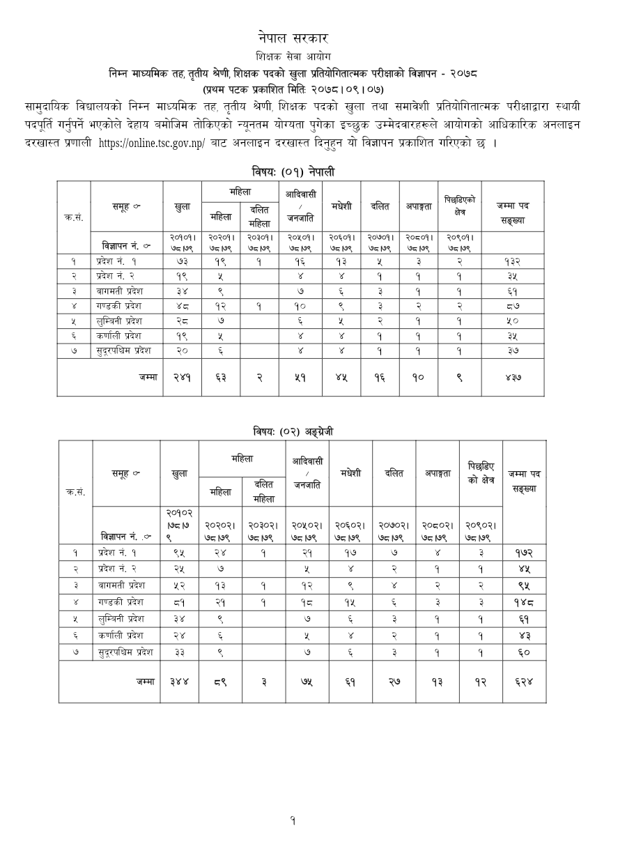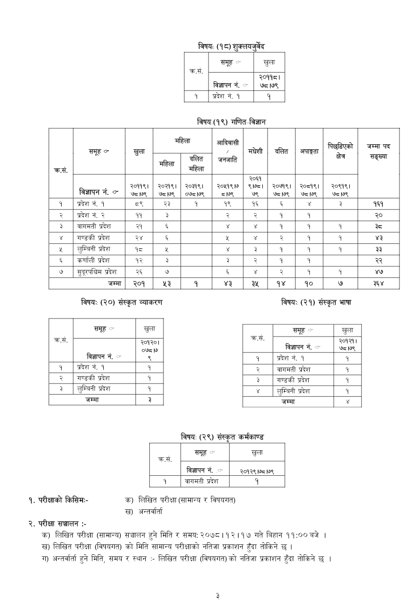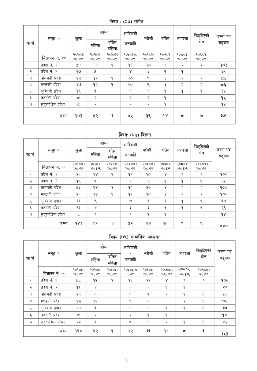 जारी सार्वजनिक सूचना अनुसार सबैभन्दा बढी अंग्रेजी विषयमा ६२४ जना शिक्षकका लागि दरखास्त आह्ववान भएकाे छ । त्यस्तै, नेपाली विषयमा ४३७, गणितमा ३७१, विज्ञानमा ४४०, सामाजिक अध्ययनमा ३५३, शुक्लयर्वेदमा एक, गणित-विज्ञानमा ३६४, संस्कृत व्याकरणमा तीन, संस्कृत भाषामा चार र संस्कृत कर्मकाण्डमा एक शिक्षकका लागि काेटा छुट्याइएकाे छ ।