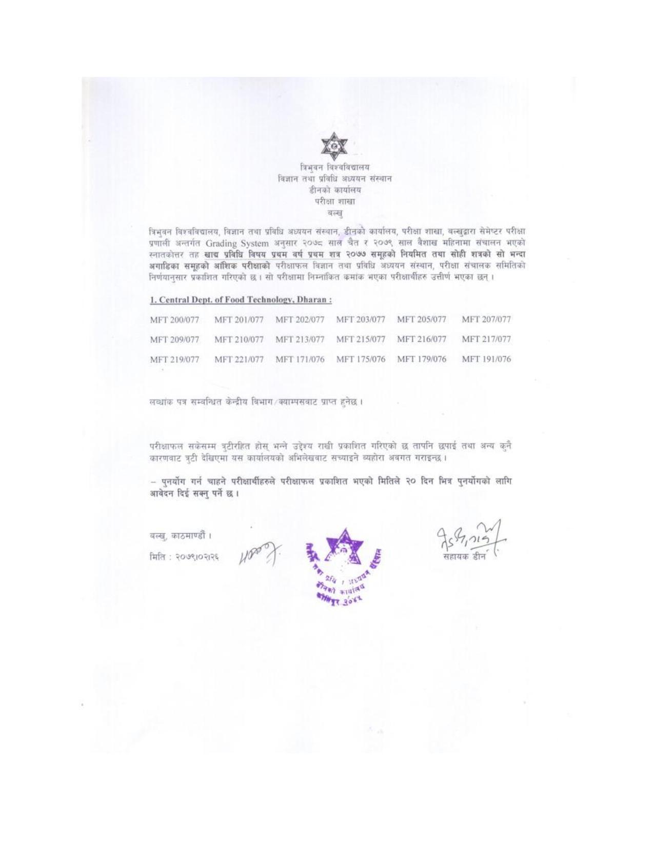 त्रिभुवन विश्वविद्यालय विज्ञान तथा प्रविधि अध्ययन संस्थान डीनको कार्यालय परीक्षा शाखा बल्खुद्धारा सेमेष्टर परीक्षा प्रणाली अन्तर्गत ( ग्रेडिङ्ग सिस्टम ) अनुसार २०७८ साल चैत्र र २०७९ साल वैशाख महिनामा सञ्चालन भएको स्नातकोत्तर तह खाद्य प्रविधि विषय प्रथम बर्ष, प्रथम शत्र २०७७ समूहको नियमित तथा सोही शत्रको सो भन्दा अगाडिको आंशिक परीक्षाको परीक्षाफल प्रकाशित भएको छ ।