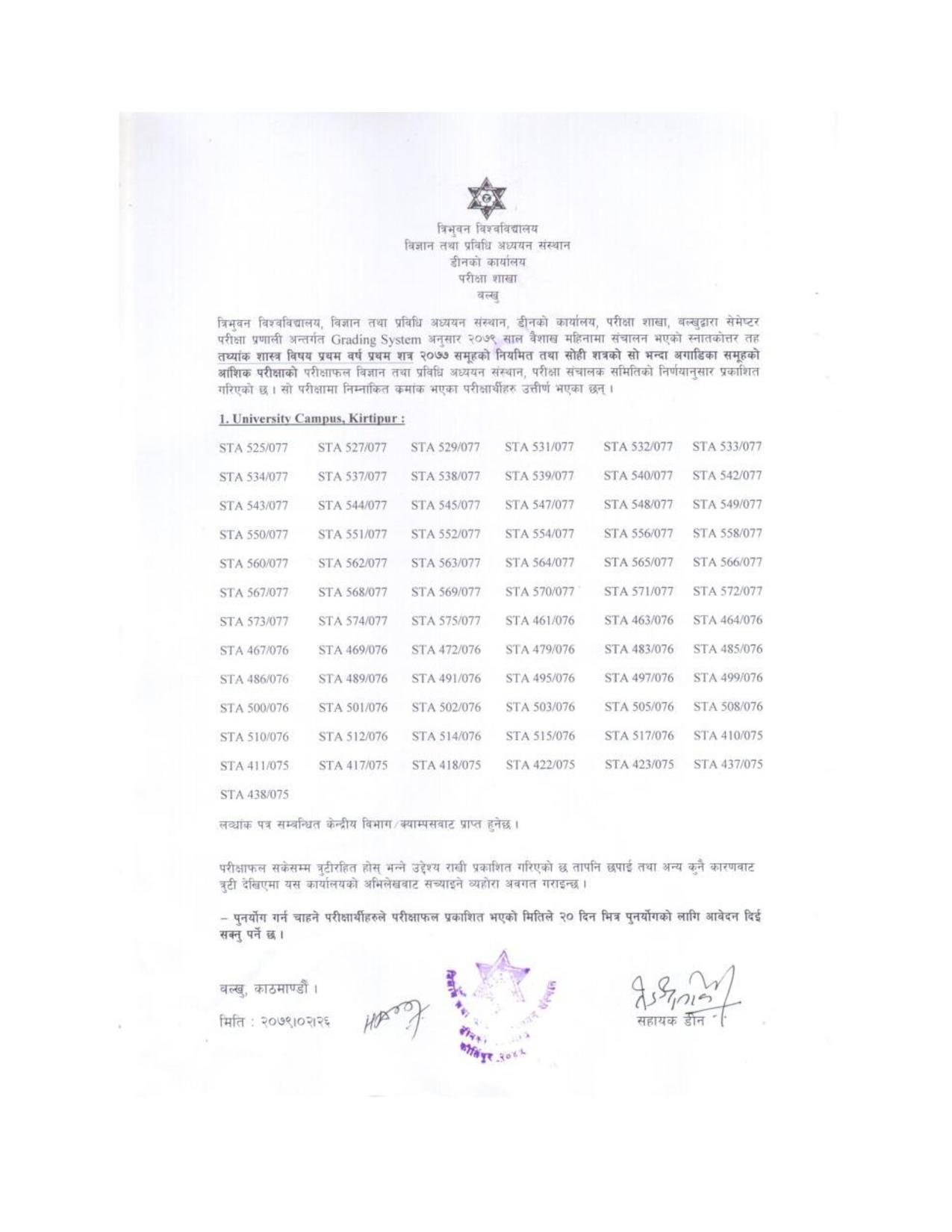 त्रिभुवन विश्वविद्यालय विज्ञान तथा प्रविधि अध्ययन संस्थान डीनको कार्यालय परीक्षा शाखा बल्खुद्धारा सेमेष्टर परीक्षा प्रणाली अन्तर्गत { ग्रेडिङ्ग सिस्टम } अनुसार २०७८ साल चैत्र र २०७९ साल वैशाख महिनामा सञ्चालन भएको स्नातकोत्तर तह तथ्यांक शास्त्र विषय प्रथम बर्ष, प्रथम शत्र २०७७ समूहको नियमित तथा सोही शत्रको सो भन्दा अगाडिको आंशिक परीक्षाको परीक्षाफल प्रकाशित गरेको हो ।