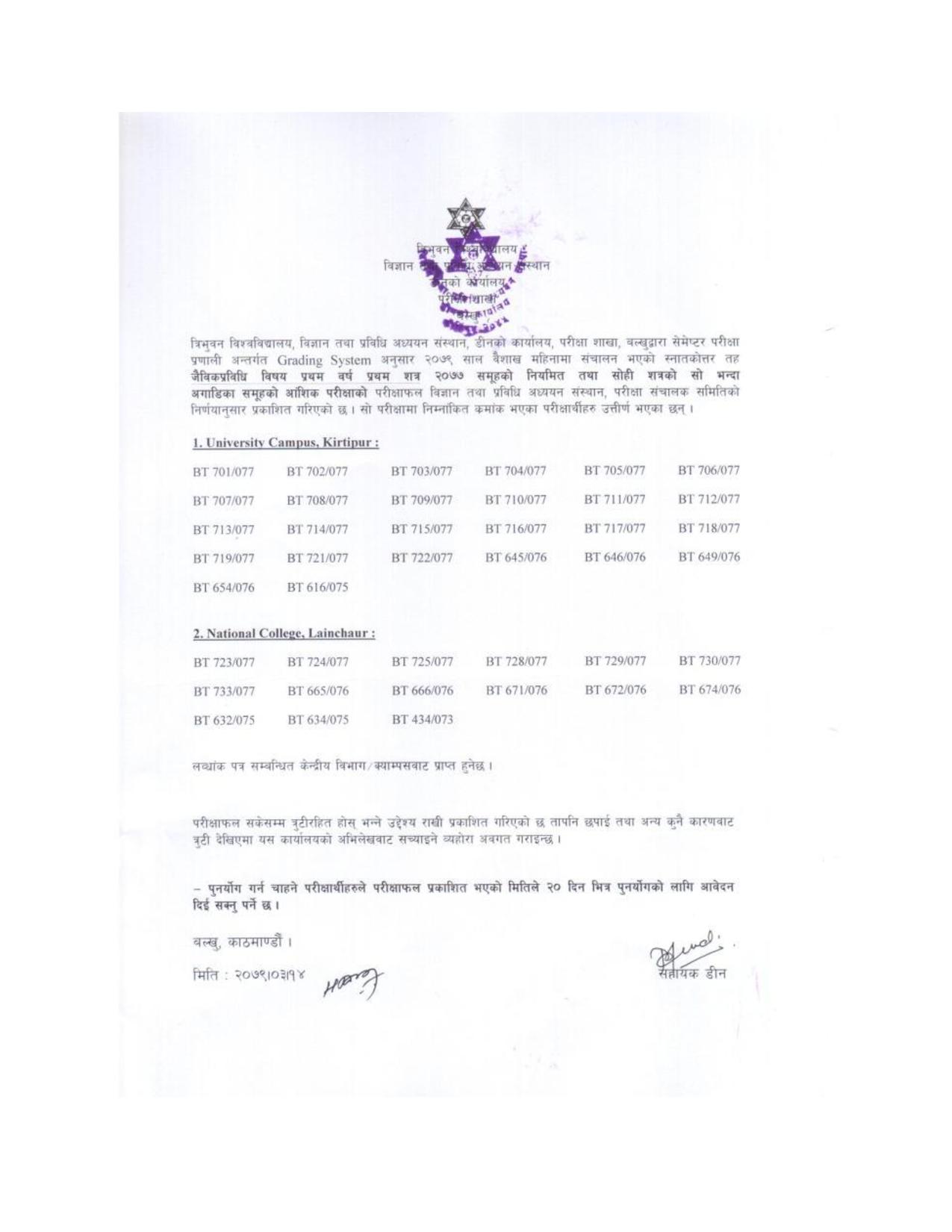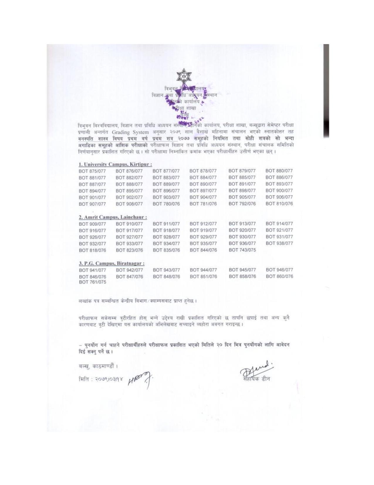 काठमाडौं । त्रिभुवन विश्वविद्यालयले विभिन्न परीक्षाको नतिजा प्रकाशित गरेको छ । त्रिभुवन विश्वविद्यालय विज्ञान तथा प्रविधि अध्ययन संस्थान डीनको कार्यालयले M.Sc. Botany I Semester -077 Exam Result 28th Jun, 2022 र M.Sc. Biotechnology I Semester -077 Exam Result 28th Jun, 2022 को नतिजा प्रकाशित गरेको हो ।