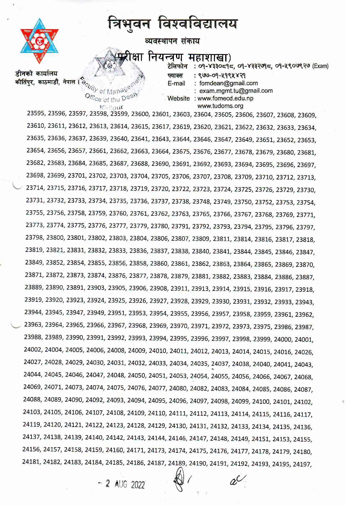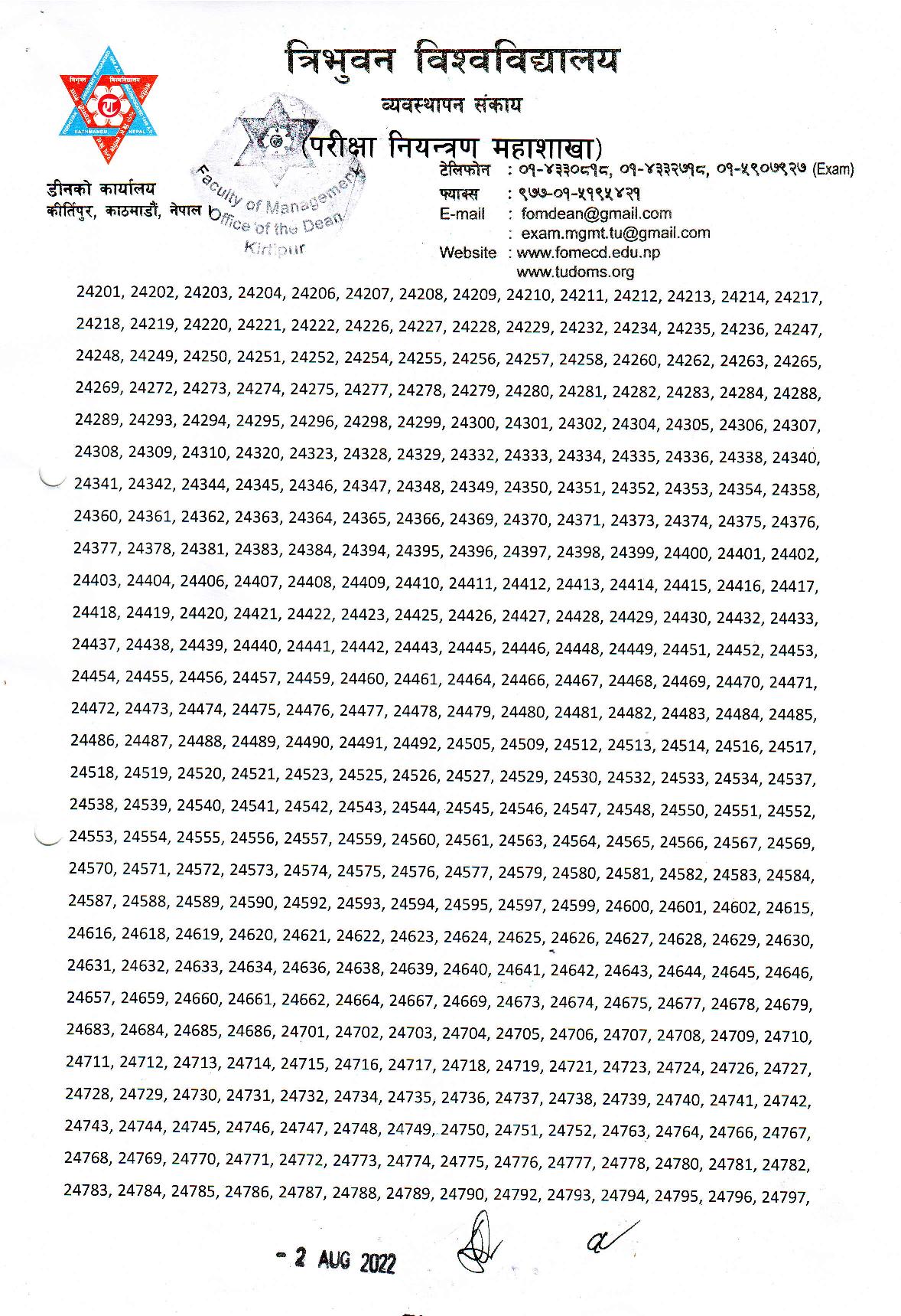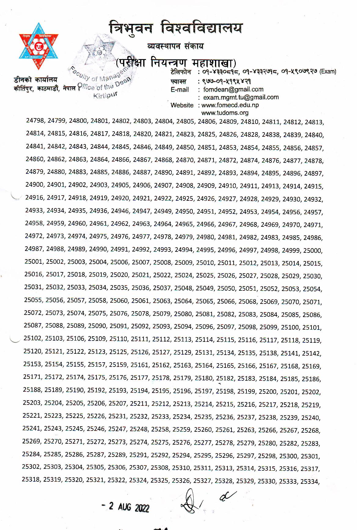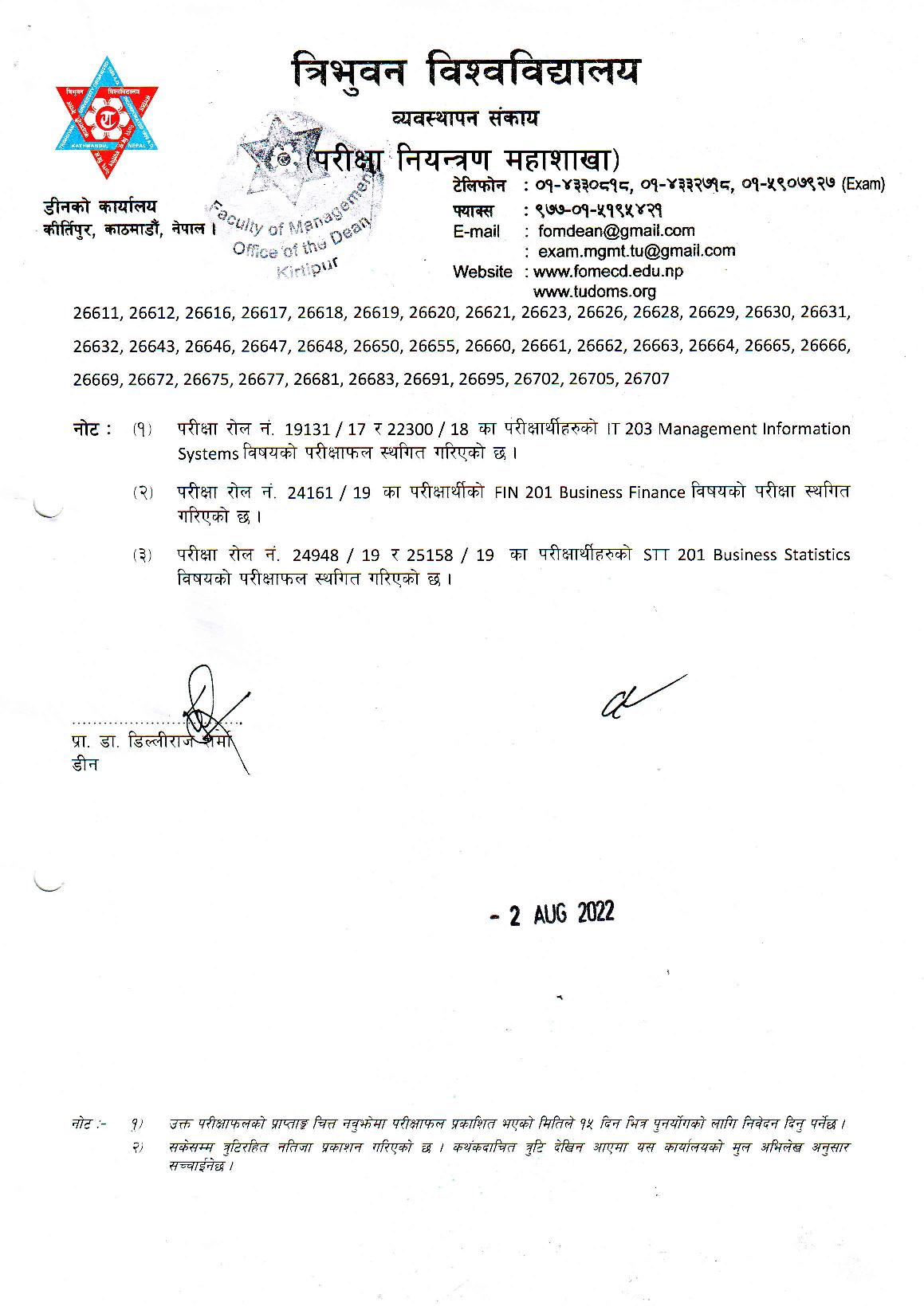 परीक्षा रोन नं. 19131/17 र 22300/17 का परीक्षाथीहरुको IT 203 Management Information system विषयको परीक्षाफल स्थगित गरिएको छ ।