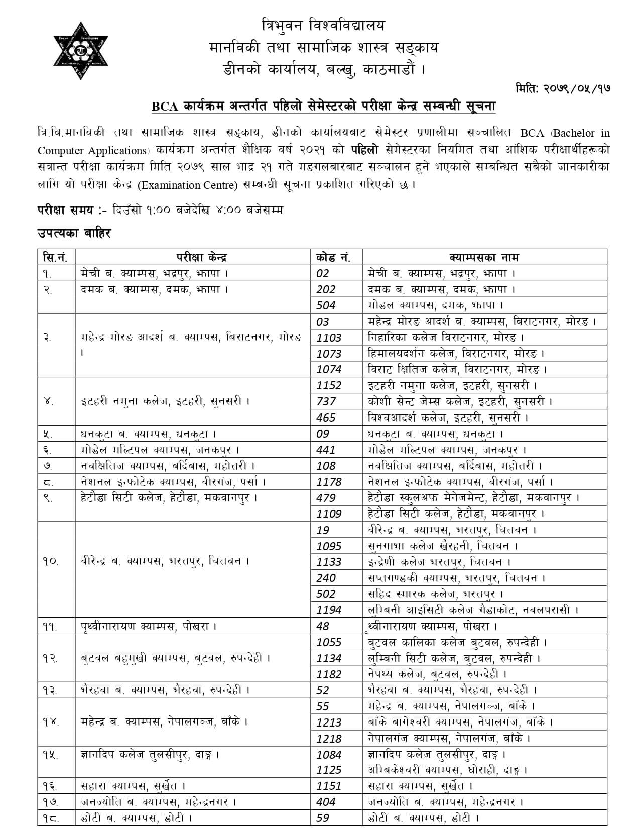 ‘त्रिवि मानविकी तथा सामाजिक शास्त्र संकाय, डीनको कार्यालयबाट सेमेस्टर प्रणालीमा सञ्चालित बीसीए कार्यक्रम अन्तर्गत शैक्षिक वर्ष २०२१ को पहिलो सेमेस्टरका नियमित तथा आंशिक परीक्षार्थीहरूको सत्रान्त परीक्षा कार्यक्रम मिति २०७९ साल भाद्र २१ गते मंगलबारबाट सञ्चालन हुने भएकाले सम्बन्धित जानकारीका लागि यो परीक्षा केन्द्र सम्बन्धी सूचना प्रकाशित गरेको छ ।’