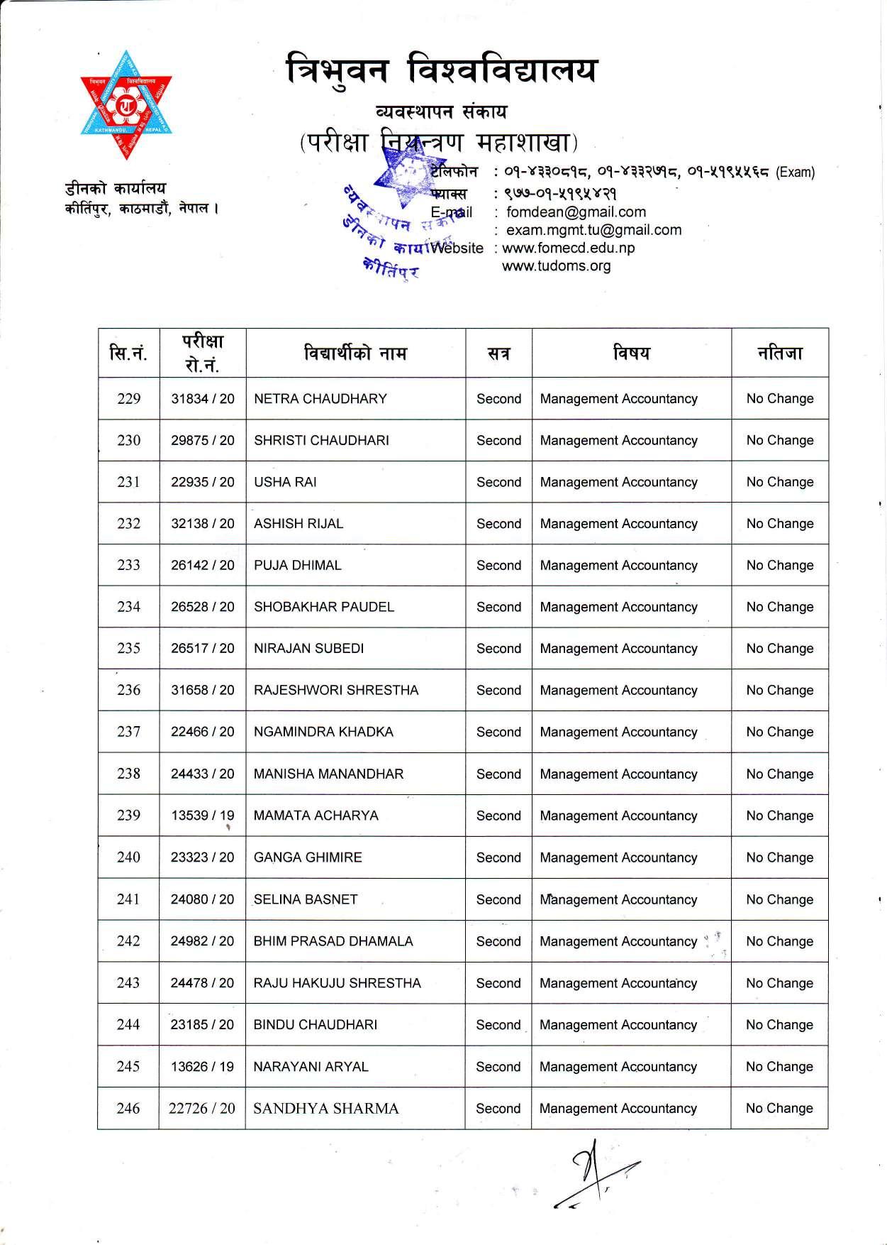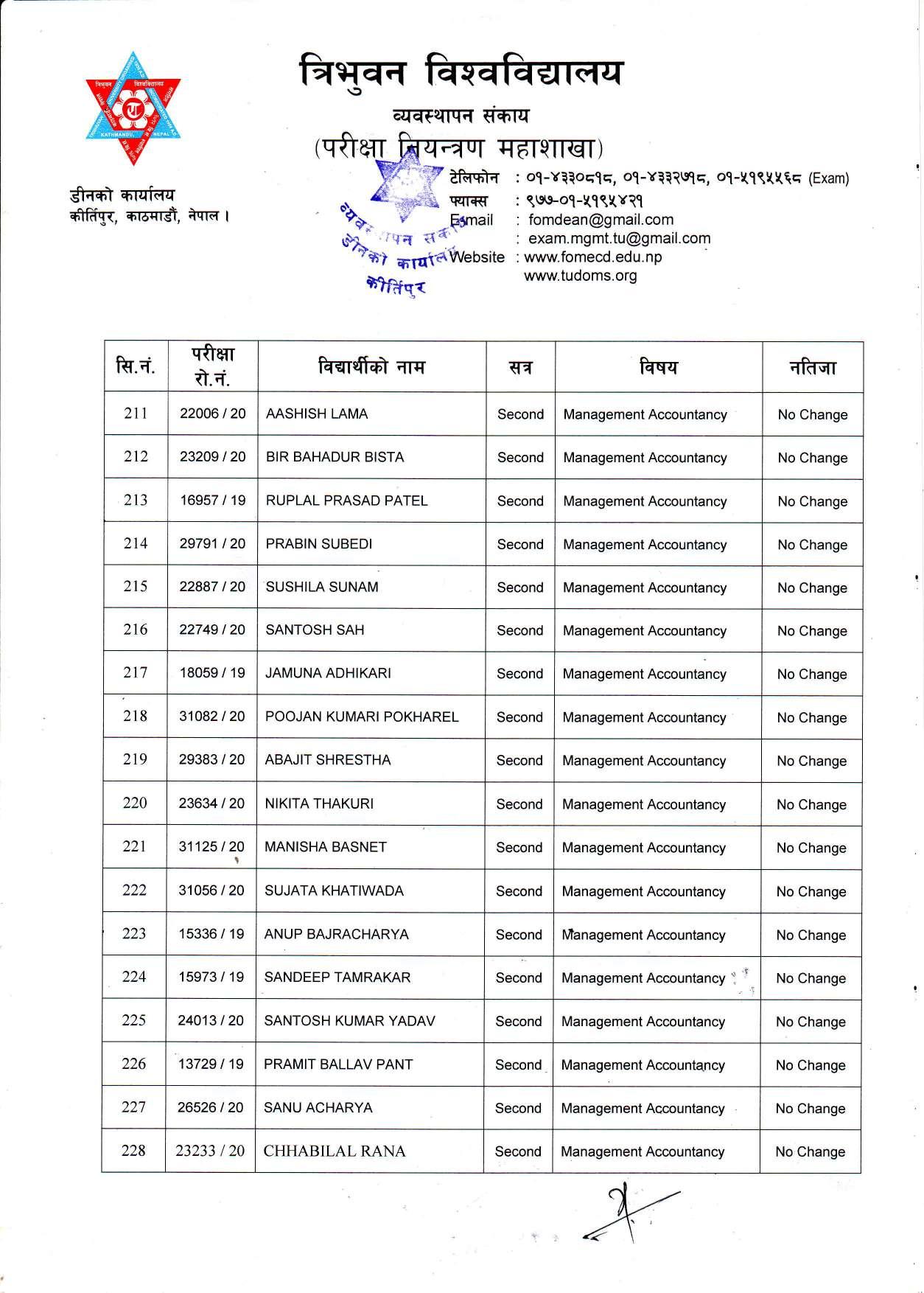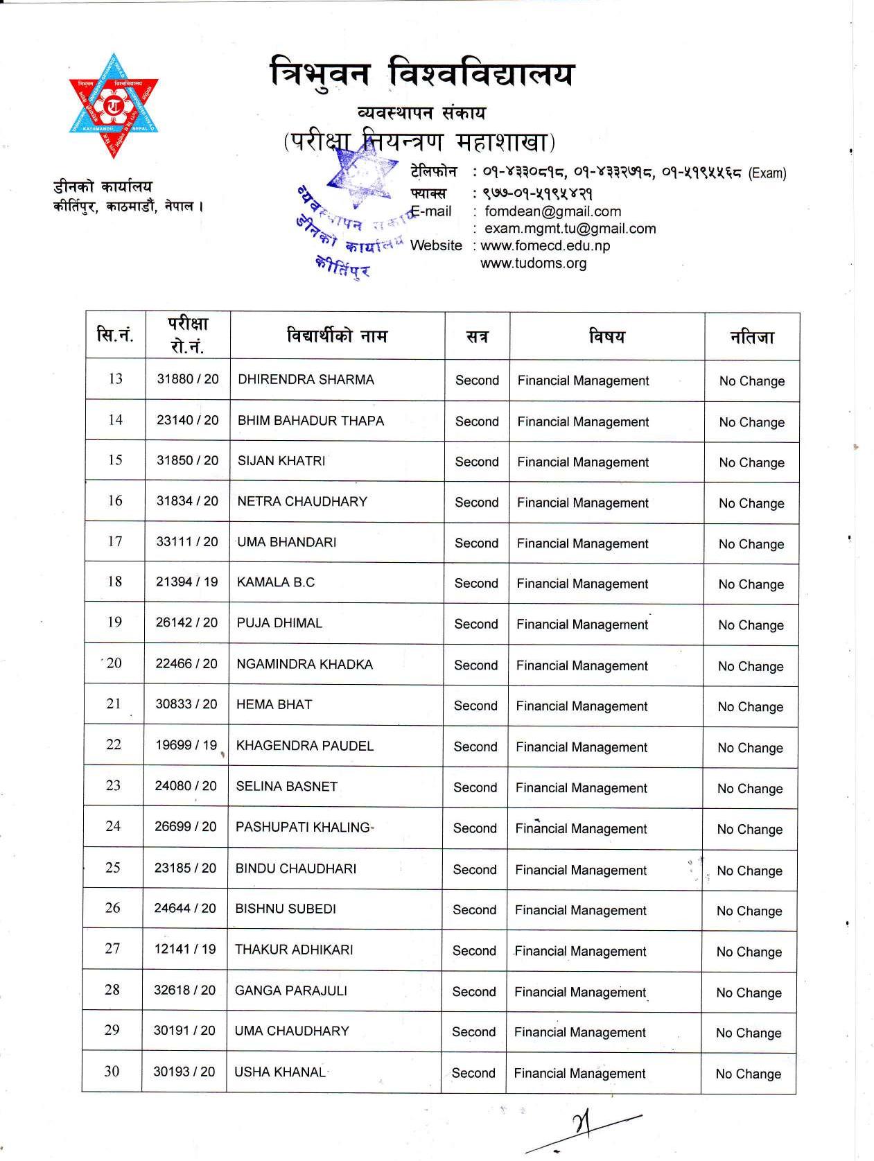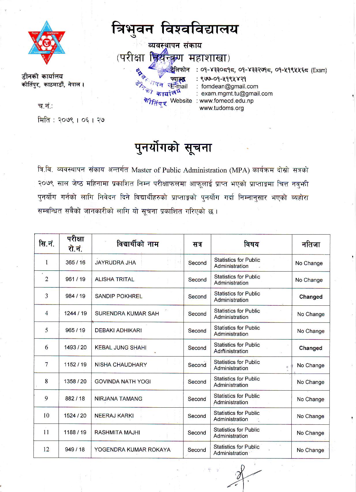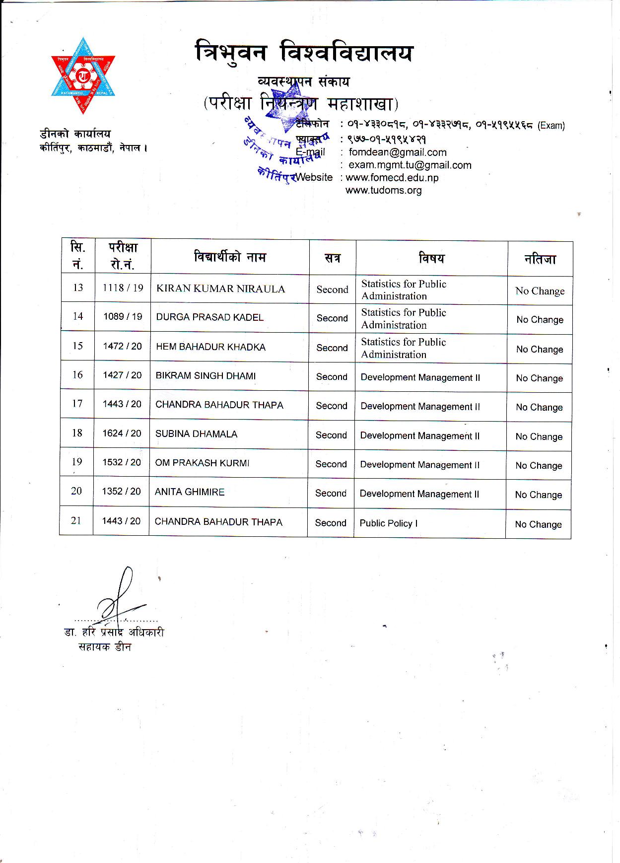 काठमाडौं । त्रिभुवन विश्वविद्यालयले स्नातक र स्नातकोत्तरका विभिन्न तीन वटा नतिजा एकसाथ प्रकाशित गरेको छ । प्रकाशित सम्पूर्ण नतिजा सबै तल अपलोड गरिएको छ ।