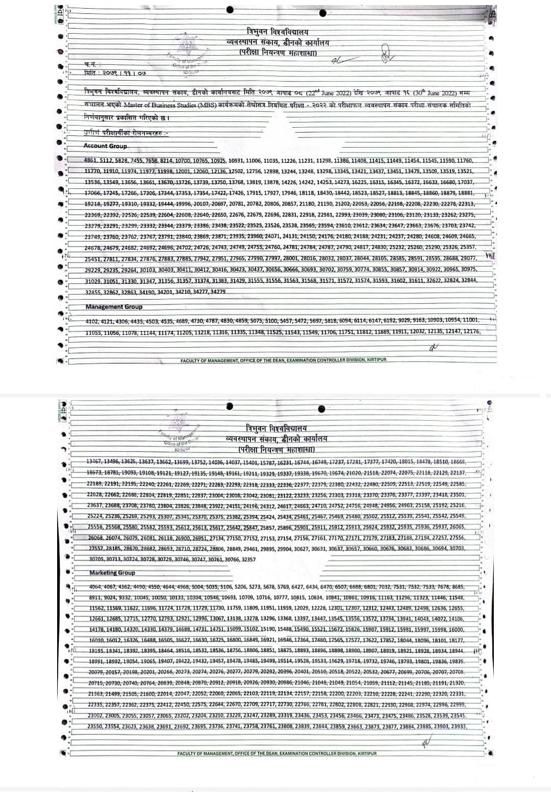 काठमाडौं । त्रिभुवन विश्वविद्यालयले नतिजा प्रकाशित गरेको छ । त्रिभुवन विश्वविद्यालय व्यवस्थापन संकाय, डीनको कार्यालय बल्खुद्वारा २०७९ असार ०८ (22nd June 2022) महिनामा संचालन भएको Master of Business studies (MBS) तेस्रो सत्र नियमित परीक्षा २०२२ को परीक्षाफल , व्यवस्थापन संकाय परीक्षा संचालक समितिको निर्णयानुसार प्रकाशित गरेको छ ।