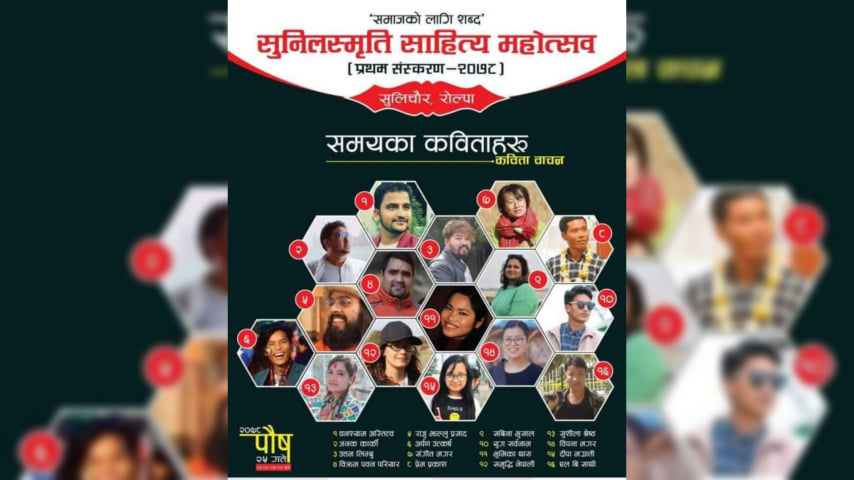 मुगु, २४ पुस। रोल्पाको सुलिचौरमा सुनिल स्मृति साहित्य महोत्सव हुने भएको छ । कार्यक्रम जिएम मुभिजको आयोजना र सुनिल स्मृति गाउँपालिको आर्थिक सहयोगमा हुन लागेको हो ।