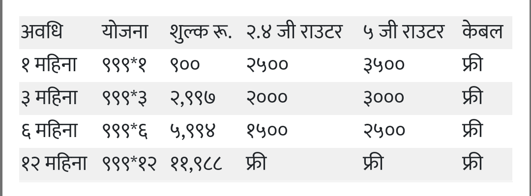 वार्षिक प्याकेज लिने उपभोक्ताका लागि जडान र राउटर निःशुल्क गरिएको छ । त्यस्तै, मासिक, ३ महिने र ६ महिने प्याकेज लिँदा जडान र केबल निःशुल्क हुनेछ ।