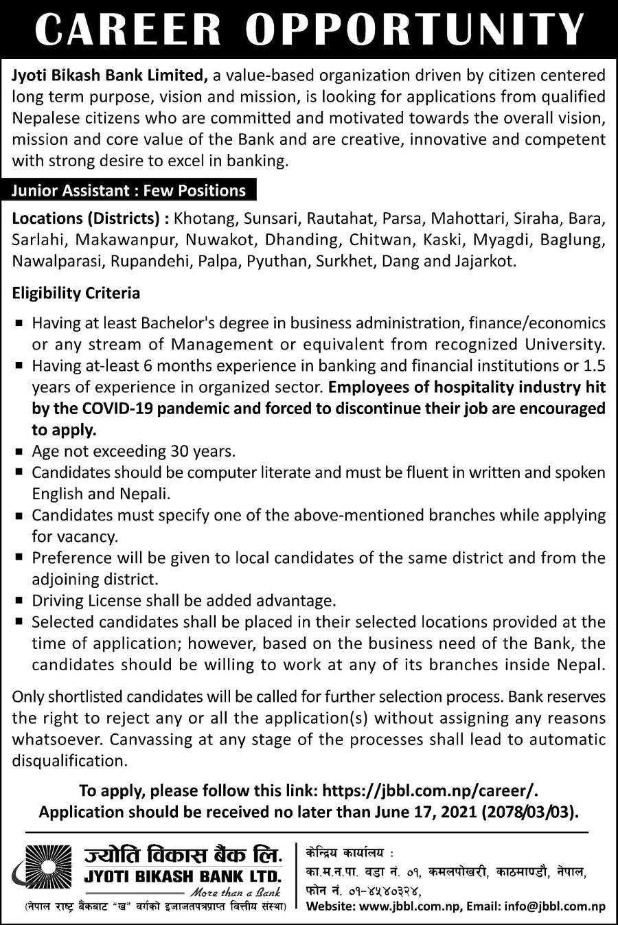 ज्योति विकास बैंकले कर्मचारीको माग गरेको छ । बैंकले बैंकएल जुनियर असिस्टेन्ट पदका लागी २२ बटा जिल्लाका लागी कर्मचारी माग गरेको हो ।