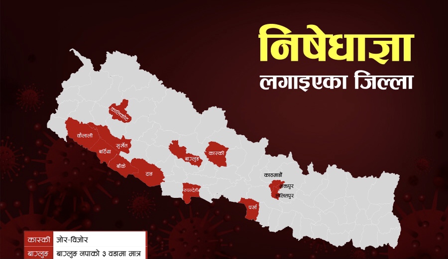 गृह मन्त्रालयबाट प्राप्त विवरण अनुसार मंगलबारसम्ममा ११ जिल्लामा पूर्ण र दुई जिल्लामा आंशिक निषेधाज्ञा छ । काठमाडौं, भक्तपुर, ललितपुर, बाँके, दाङ, कैलाली, रुपन्देही, पर्सा र सुर्खेतमा पूर्ण निषेधाज्ञा छ । कास्कीमा पनि निषेधाज्ञा छ, सवारीसाधनमा जोर–विजोर प्रणाली लगाइएको छ ।