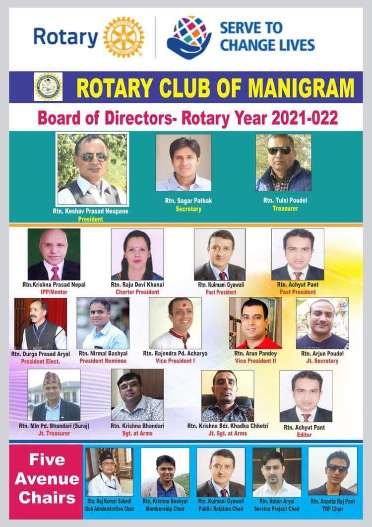 रोटरी क्लब अफ मणिग्रामको वर्ष २०२१/२२ का लागि केशवप्रसाद न्यौपानेको नेतृत्वमा कार्य समिति गठन भएको छ । शिक्षण पेशामा आवद्ध उहाँ विभिन्न संघ संस्थामा रही समाजलाई सकारात्मक परिवर्तन गर्न कसरी सकिन्छ भनी सदैव चिन्तन गर्ने सामाजिक व्यक्ति हुनुहुन्छ ।