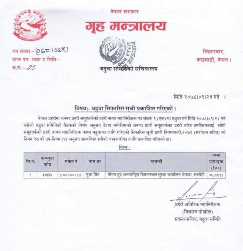 पूजा सिंह डिआइजीमा बढुवा सिफारिस