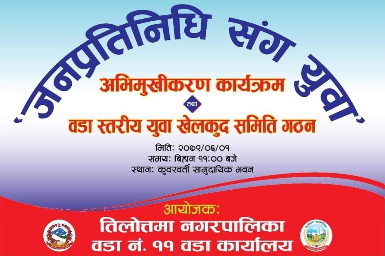 रूपन्देही जिल्ला र प्रदेश स्तरमै सम्भवत पहिलो पटक हुन गैरहेको सो कार्यक्रममा उपस्थित हुनको लागि वडा नम्बर ११ का सम्पूर्ण युवाहरूलाई आग्रह गरिएको छ । युवाहरू देश र समाजको विकासका लागि अगाडि बढुन र सामाजिक क्रियाकलापमा उत्तरदायी होउन भन्ने उदेश्यले आयोजना गरिने सो कार्यक्रममा वडा स्तरीय युवा समिति गठन गरिने भएको हो ।