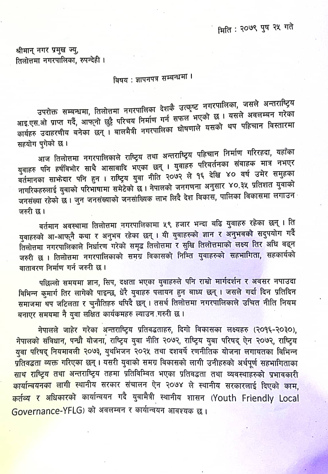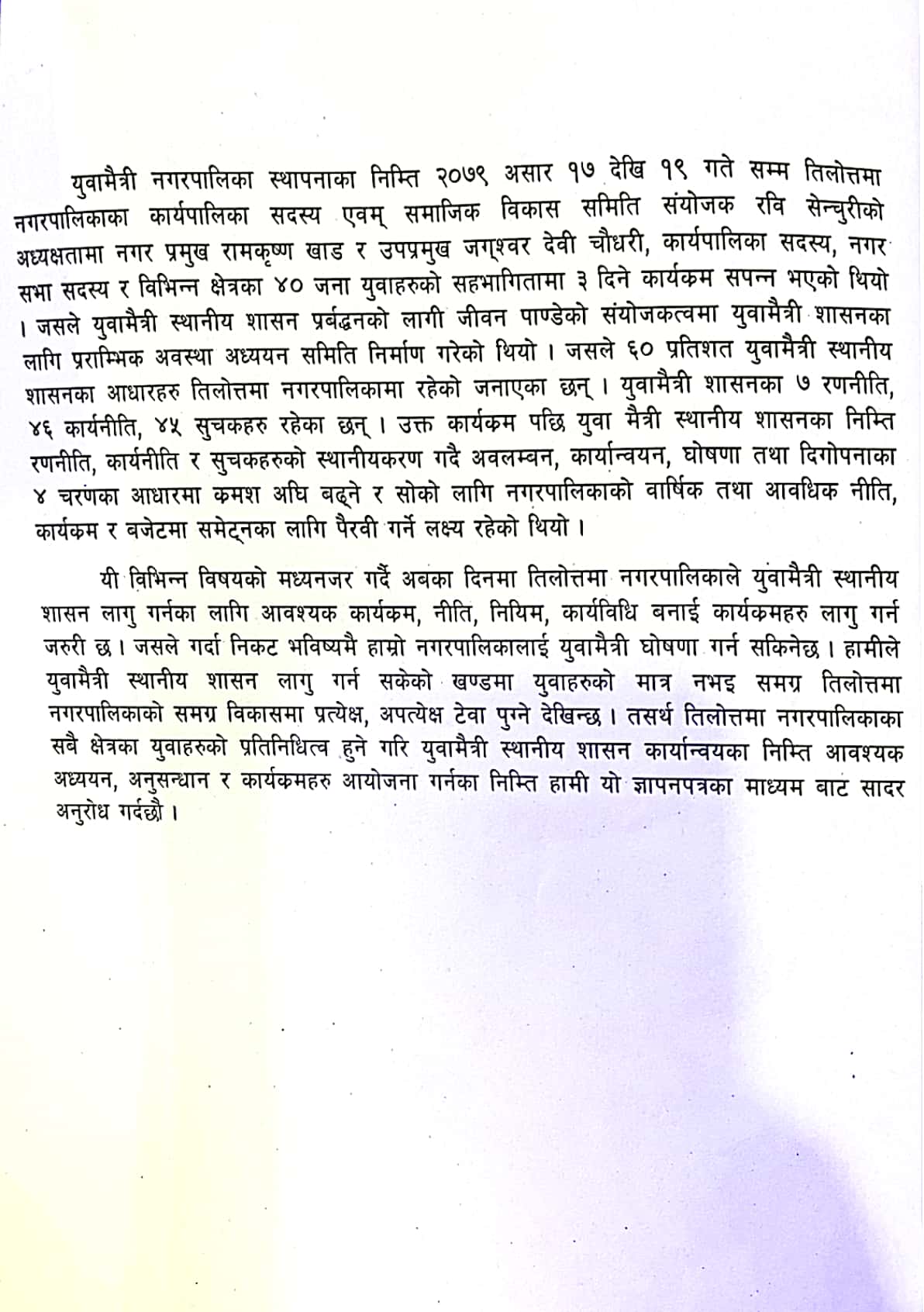 गत आषाढ १७ गतेदेखि १९ गतेसम्म तिलाेत्तमा नगरपालिकाभित्रका विभिन्न क्षेत्रका ४० जना युवाहरूकाे सहभागितामा तिनदिने कार्यक्रम सम्पन्न भएकाे स्मरणसमेत गराइएकाे छ । युवामैत्री स्थानीय शासन प्रवर्द्धनका लागि जीवन पाण्डेको संयाेजकत्वमा युवामैत्री शासनका लागि प्रारम्भिक अवस्था अध्ययन समिति समेत निर्माण गरेकाे समेत ज्ञापनपत्रमा स्मरण गराइएको छ ।