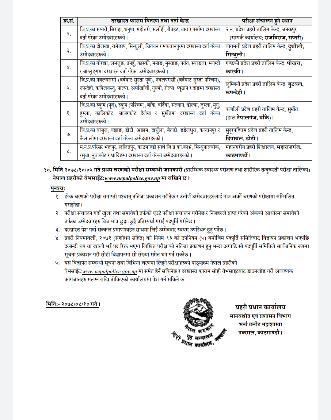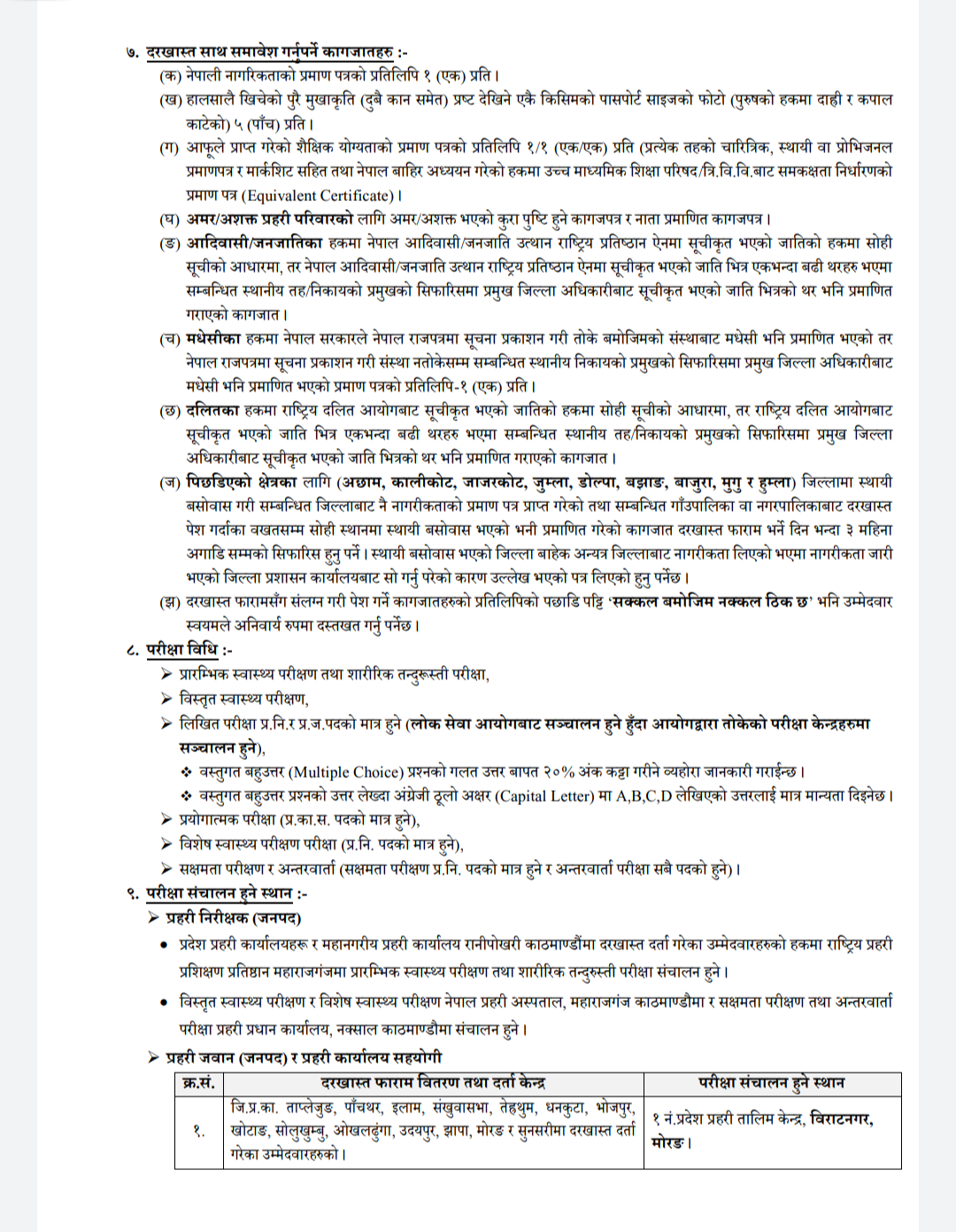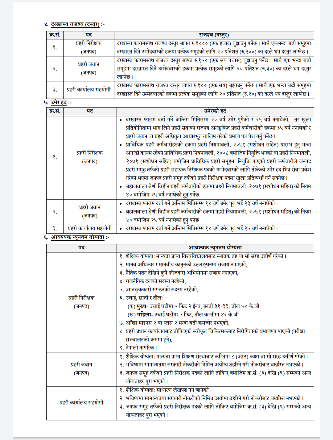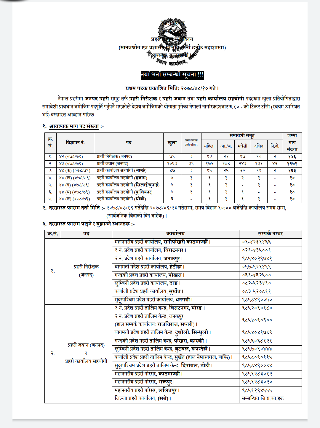 नेपाल प्रहरीमा प्रहरी निरीक्षकमा १४६, प्रहरी जवानमा १९७१ र सहयोगीमा ९,भान्छे १६३, हजाम १०, सिलाई बनाइ १०, कुचिकर १० र धोबी १० ०का लागि दरखास्त आव्हान गरेको छ ।