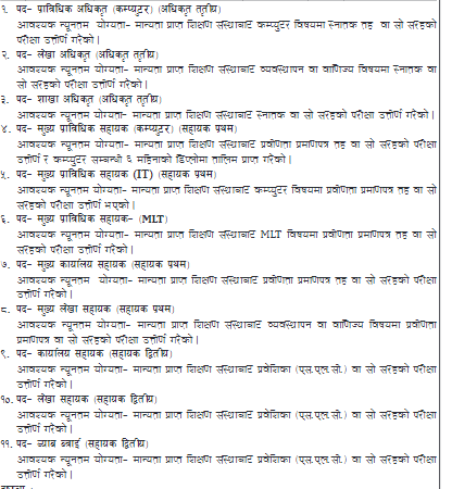 विभिन्न १३ पदका लागि स्थायी पदपूर्ति गर्न आयोगले विज्ञापन आह्वान गरेको हो । विश्वविद्यालयले प्राविधिक अधिकृत, लेखा अधिकृत, शाखा अधिकृत, मुख्य प्राविधिक सहायक (कम्युटर, आइटी र एमएलटी), मुख्य कार्यालय सहायक, मुख्य लेखा सहायक, कार्यालय सहायक, लेखा सहायक र ल्याब ब्वाईका लागि विज्ञापन आह्वान गरेको हो ।