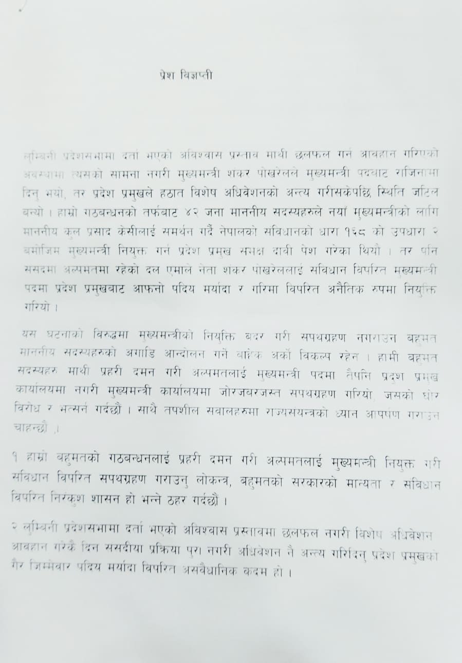 लुम्बिनी प्रदेशमा प्रदेश प्रमुखले अल्पमतको दलको नेतालाई मुख्यमन्त्रीमा नियुक्ति र सपथ गराइएको भन्दै विपक्षी गठवन्धन र अन्य दलहरुले कानूनी र राजनीतिक लडाइँ लड्ने बताएका छन् ।