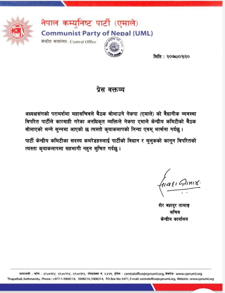 अवैध बैठकमा सहभागी नहुन केन्द्रीय सदस्यलाई एमालेको यस्तो आग्रह ( प्रेस वक्तव्य सहित )