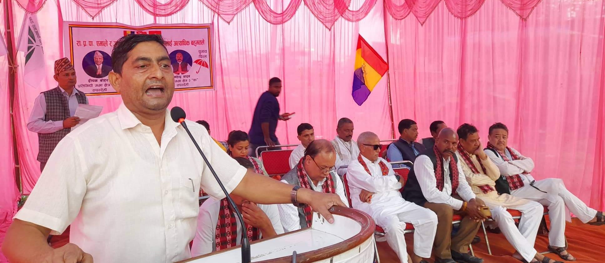 भैरहवा । रुपन्देही सदरमुकाम भैरहवाकाे बिकासकाे पर्याबाचिकाे रुपमा दिपक बाेहाेरा रहेकाे एक कार्यक्रमका बक्ताहरुले बताएका छन् । राप्रपा, एमाले र जसपाकाे तीन दलिय तालमेलबाट रुपन्देही क्षेत्र नम्बर ३ बाट प्रतिनिधि सभा सदस्य पदका उम्मेद्वार रहेका दिपक बाेहाेरा र प्रदेश सदस्य उम्मेद्वार महेन्द्र यादबकाे चुनाब प्रचार प्रसार कार्यलय वडा नम्बर ३ काे शुभारम्भ कार्यक्रममा बाेल्ने वक्ताहरुले त्यस्ताे बाेलेका हुन् ।