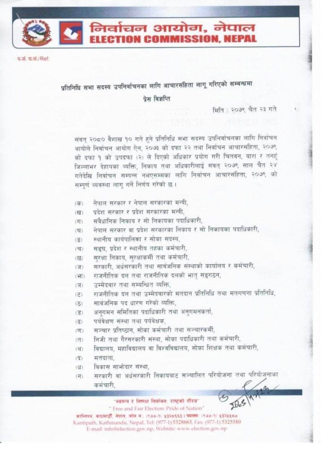 आउँदो बैशाख १० गते हुने प्रतिनिधिसभा सदस्य उपनिर्वाचनको लागि आजबाट आचारसंहिता लागू
