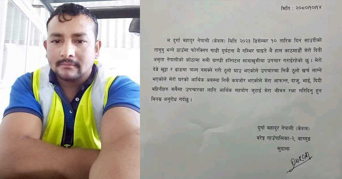 नेपालबाट सकुशल काम गर्न गएका दुर्गा बहादुर नेपालीले हाल डिसेम्बर १०, २०२३ अर्थात् मंसिर २४, २०८० आईतबारका दिन साउदी अरबमा फोरक्लिप गाडी दुर्घटना हुँदा गंभीर रूपमा घाइते हुन गएका थिए । उनको शरिरको देब्रे खुट्टा र ढाडमा चोट लागेको छ, र जसले गर्दा उनी चल्न नसक्ने भएका छन् । उनको काम गर्ने संस्थाले साउदीमा उपचार गर्न सकिँदैन भनेर उनलाई नेपाल पठाएको थियो । नेपालमा अहिले उनको उपचार चली रहेको छ, तर उपचारमा धेरै पैसा खर्च हुने र आर्थिक रूपमा कमजोर भएकोले उनले देश तथा विदेशमा रहनुहुने सम्पूर्ण आमा बुवा, दाजु भाई दिदी बहिनी लगायत सम्पूर्ण नेपालीहरुमा सहयोग गर्न अपील गरेका छन्, साथै विभिन्न संघसंस्था, पत्रकारहरुलाई पनि सहयोगका लागि अपील गरेका छन्। अहिले उनको उपचार काठमाडौंमा स्थित ग्राण्डी अस्पतालमा भइरहेको छ र उनको आफ्नै दिदी गायिका अमृता नेपालीले पनि सबैलाई सहयोगका लागि अपिल गरेकी छन् । साथै सहयोगको देवीनगर निवासी गणेश क्षेत्रीले पनि सबैजनाले अगाडि आएर आफूले सकेको सहयोग गर्न आग्रह गरेका छन ।