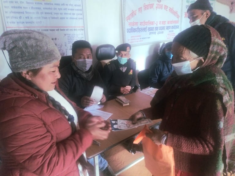 खोटाङ, ५ माघ। खोटाङको साकेला गाउँपालिकाले वडा–वडामा शिविर सञ्चालन गरेर सामाजिक सुरक्षाभत्ताको दोस्रो त्रैमासिक किस्ता वितरण गरेको छ । शारीरिक अशक्तताका कारण बैंकसम्म पुग्न कठिनाइ बेहोरिरहेका ज्येष्ठ नागरिक, अशक्त तथा अपाङ्गता भएका लाभग्राहीको सुविधाका लागि गाउँपालिकाले ५ वडाको ६ स्थानमा भुक्तानी शिविर सञ्चालन गरेर सबै खालका सामाजिक सुरक्षाभत्ता वितरण गरेको हो ।