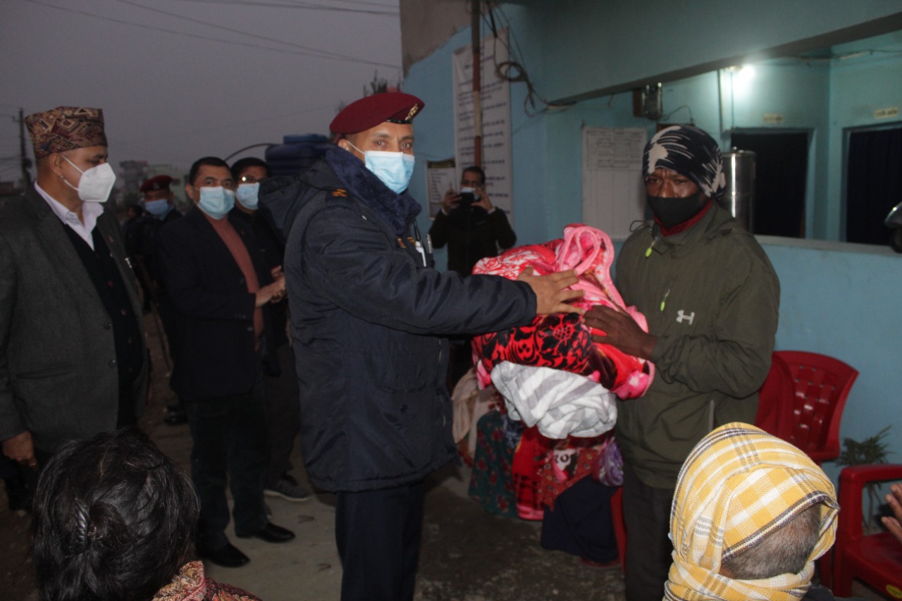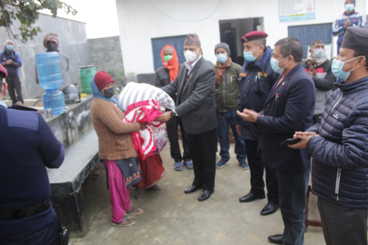कपिलवस्तु। कपिलवस्तुमा बढिरहेको शितलहर र चिसोले अति बिपन्न परिवारको दैनिक जीवनयापनमा देखिएको कठिनाईमा सहजता ल्याउनको लागि जिल्ला विपद व्यवस्थापन समितीको सहकार्यमा ४०० थान ब्लाङकेट बोकेर कपिलवस्तु प्रहरी २४८ जना अती विपन्न परिवारको साहारा बन्दै बस्तिमा पुगेको छ। माघ महिनामा समेत चिसो कम नभएपछि १२ र १३ गते प्रहरी र प्रशासनका पदाधिकारी न्यानो कम्मल लिएर बस्तिमा पुगेका हुन्।
