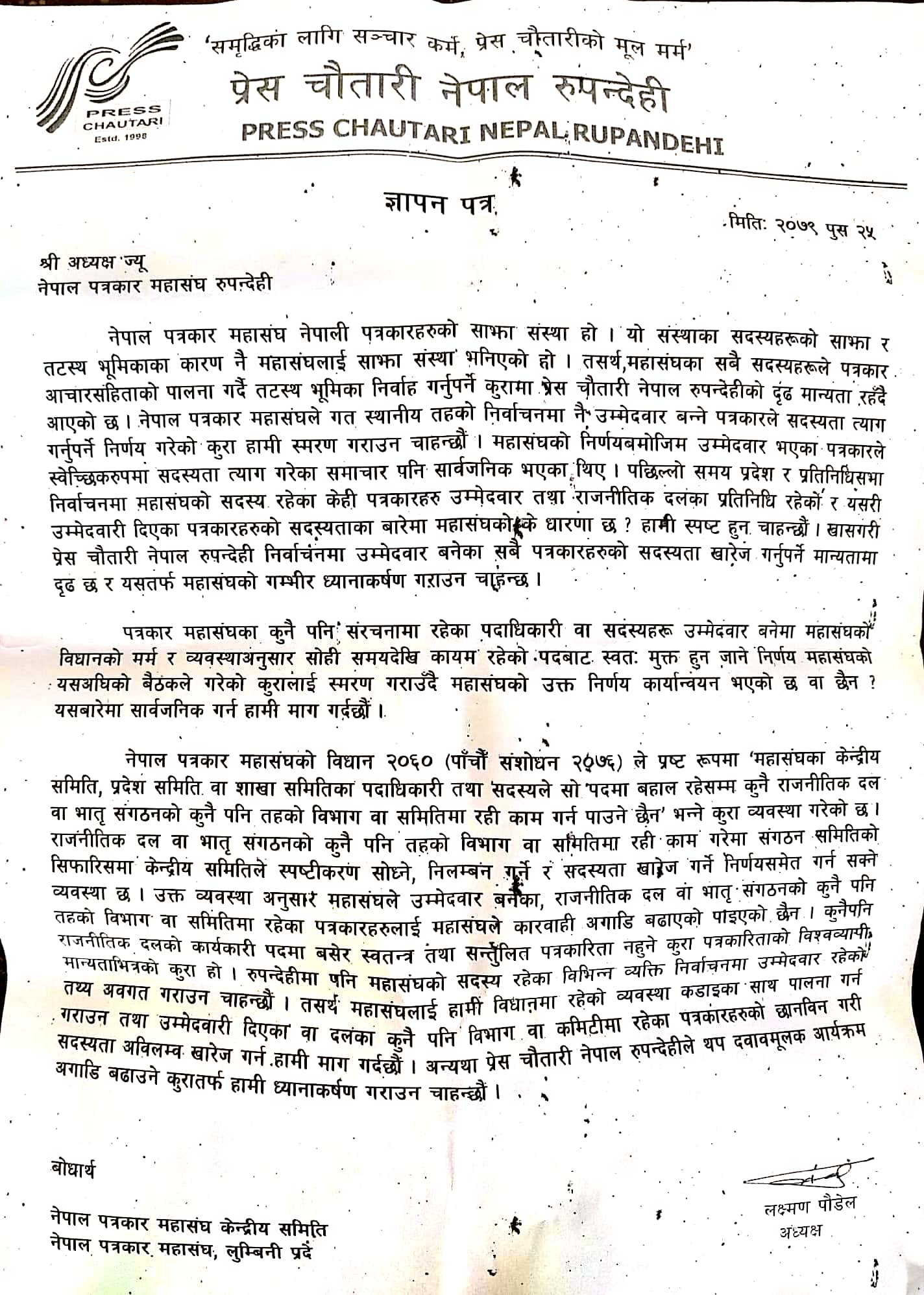 रुपन्देहीमा पनि महासंघको सदस्य रहेका विभिन्न व्यक्ति निर्वाचनमा उम्मेदवार रहेको भन्दै चौतारीले महासंघलाई विधानमा रहेको व्यवस्था कडाइका साथ पालना गर्न÷गराउन तथा उम्मेदवारी दिएका वा दलका कुनै पनि विभाग वा कमिटीमा रहेका पत्रकारहरुको छानबीन गरी सदस्यता अविलम्ब खारेज गर्नुपर्ने चौतारीको माग छ । अन्यथा प्रेस चौतारी नेपाल, रुपन्देहीले थप दबाबमुलक कार्यक्रम अगाडि बढाउने चेतावनी समेत दिएको छ ।