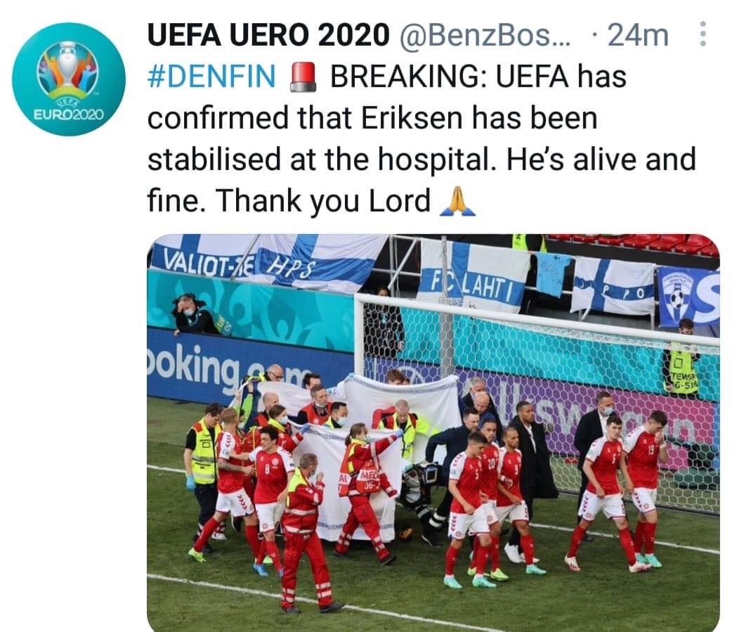 खेलको ४३ औं मिनेटमा एरिक्सन बेहोस भएर मैदानमा ढल्न पुगेका थिए ।